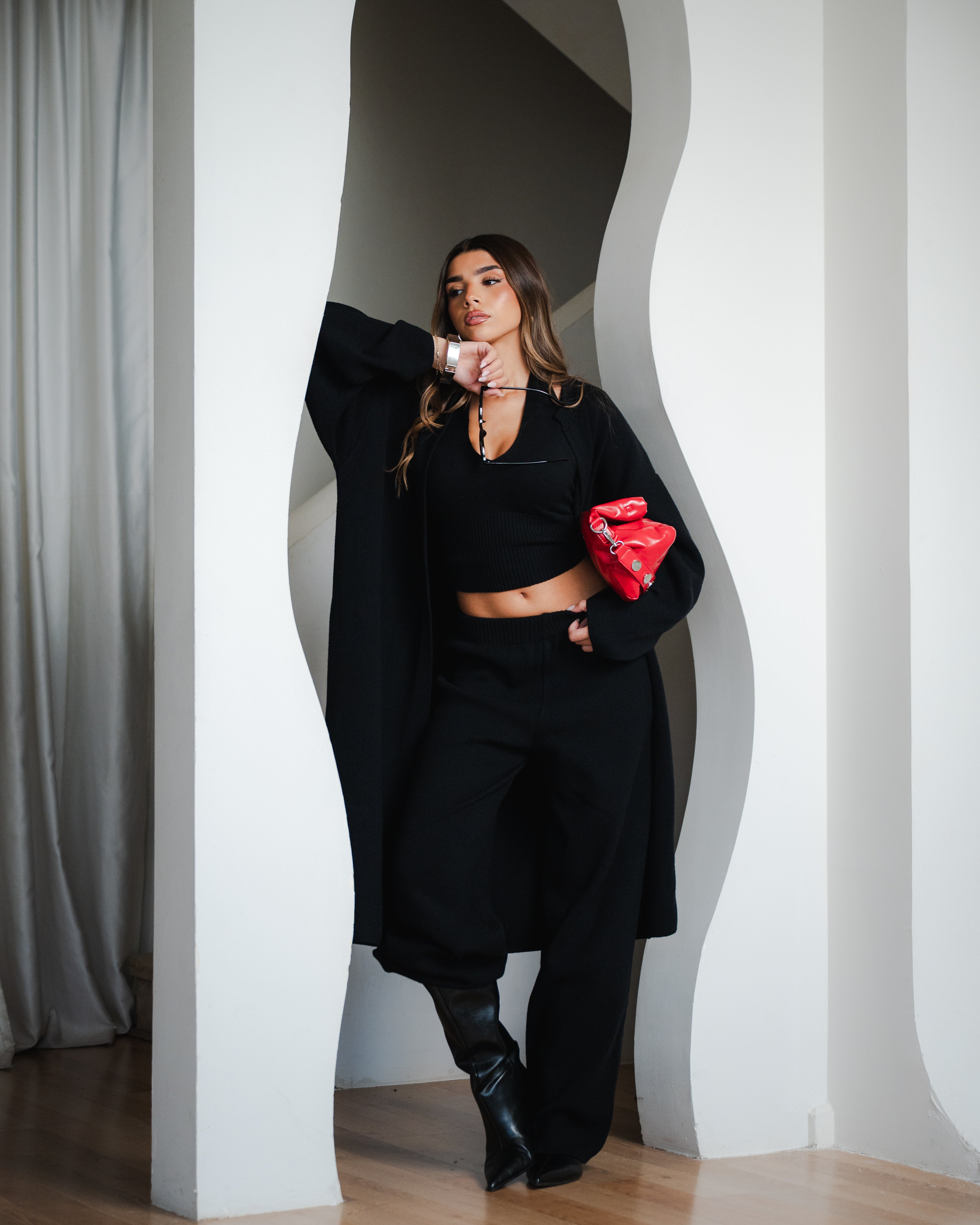 Our Black Straight Knit Pants are especially flattering on petites, as they create a long, uninterrupted vertical line that visually lengthens the legs. The straight, relaxed cut falls smoothly from hip to hem, avoiding any heaviness that can overwhelm a smaller frame. Designed to be worn either high or low on the waist, they allow you to customize the fit while maintaining a balanced silhouette. Their clean, minimal design also makes them easy to style with fitted tops or cropped knits that highlight your proportions without shortening your overall look.